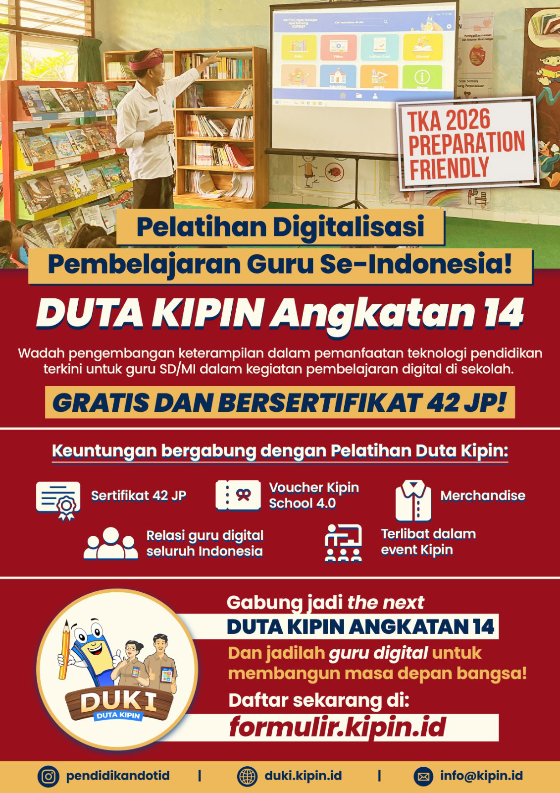 "Selama mengikuti DUKI angkatan 11 ini, banyak sekali pelajaran dan pengalaman baru bagi saya. Pembelajaran di kelas saya menjadi lebih menyenangkan dan modern. Siswa-siswa di kelas saya pun jadi termotivasi dan tertantang karena ada banyak sekali media dan metode pembelajaran yang digunakan. Pada akhirnya, KIPIN mampu hadir di tengah siswa-siswa saya sebagai penyejuk imajinasi dan pelega dahaga pengetahuan digital dengan menyuguhkan ragam fitur menarik dan relevan dengan perkembangan zaman. Terima kasih, KIPIN!"